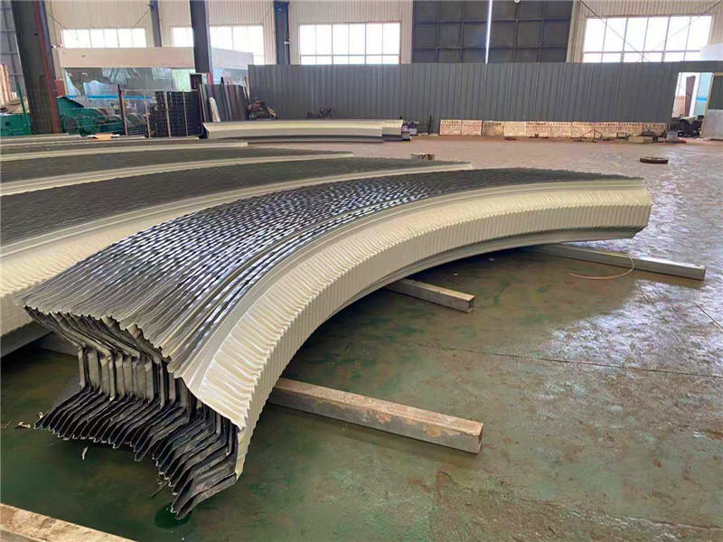 本次拱形屋頂單元板工程主要服務(wù)于某出口型廠房的建筑改造升級,客戶對結(jié)構(gòu)穩(wěn)固性、現(xiàn)場加工效率及防護(hù)性能提出了較高要求。根據(jù)需求,江蘇杰達(dá)鋼結(jié)構(gòu)工程有限公司選用了厚度為1.2mm的鋼板原材料,壓制成寬度為0.61m的成型瓦片,并采用現(xiàn)場彎板壓型技術(shù)進(jìn)行施工。