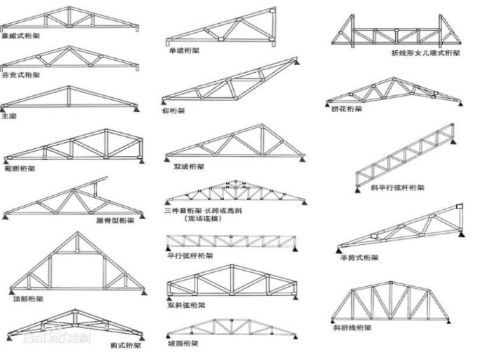 從力學(xué)方面分析,桁架外形與簡支梁的彎矩圖相似時,上下弦桿的軸力分布均勻,腹桿軸力小,用料很省;從材料與制造方面分析,木桁架做成三角形,鋼桁架采用梯形或平行弦形,鋼筋混凝土與預(yù)應(yīng)力混凝土桁架為多邊形或梯形為宜。