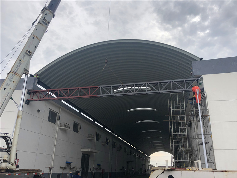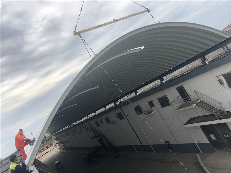 概況:該拱形屋頂?shù)目缍葹?6米,長度為120米,建筑面積為1920平方米。使用的是臺(tái)灣尚興0.9mm的TS280GD-Z高強(qiáng)彩涂卷,顏色為白色。該拱形屋頂倉間罩棚需要安裝山墻,山墻亦是使用屋面的白色彩鋼瓦壓制而成。