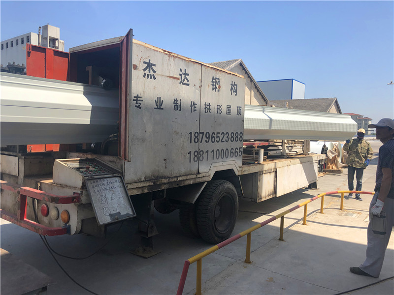 圖片二:江蘇杰達(dá)鋼結(jié)構(gòu)工程有限公司的拱形屋頂壓制設(shè)備已經(jīng)抵達(dá)現(xiàn)場,并正在壓制拱形屋頂單元瓦片。